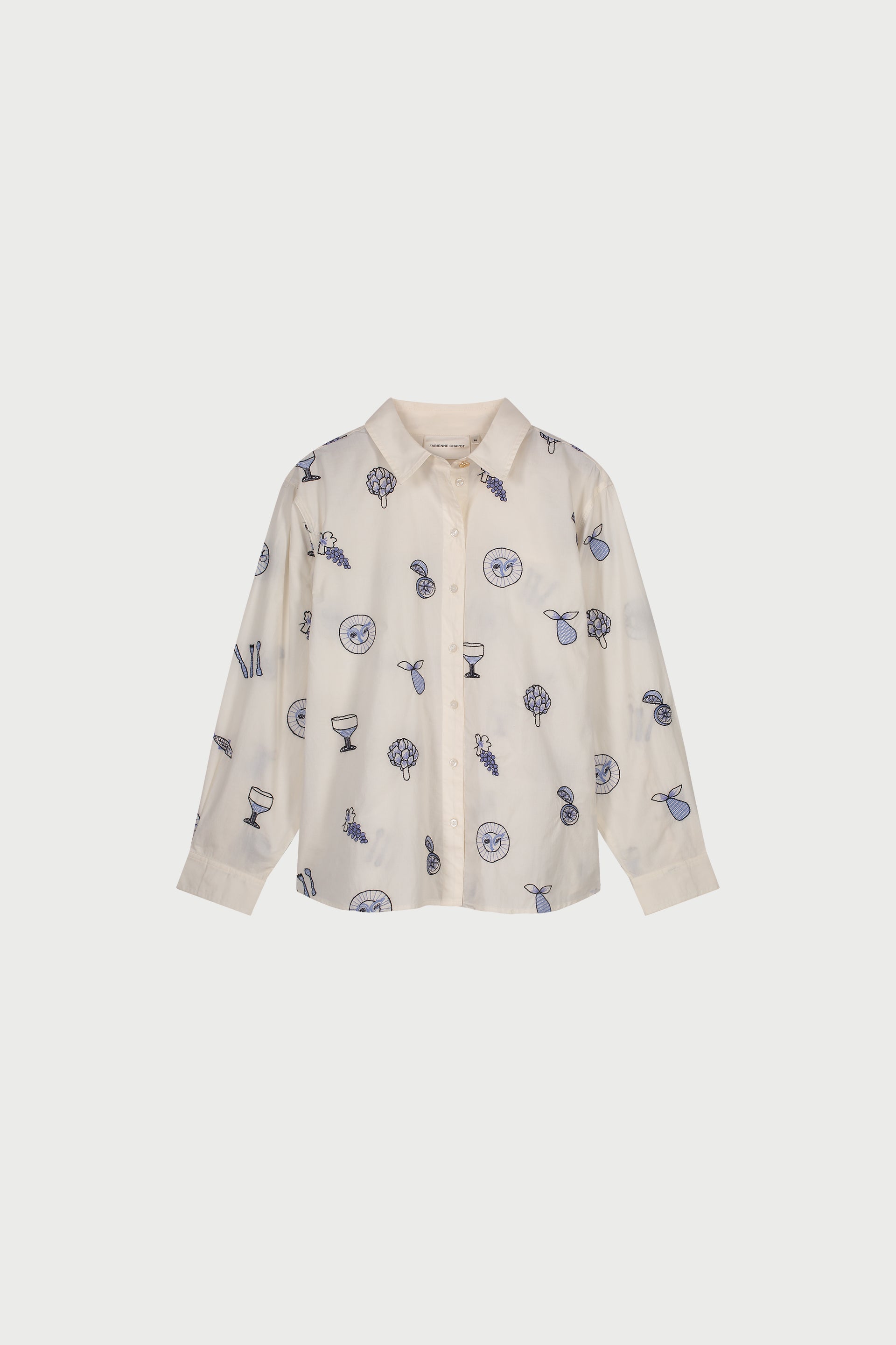 This white blouse is adorned with blue embroidery all over, featuring glasses and plates, reminiscent of a beautifully set summer dinner table. Made from 100% organic cotton, it's a true statement piece. Pair it with your favorite jeans for a playful, feminine look