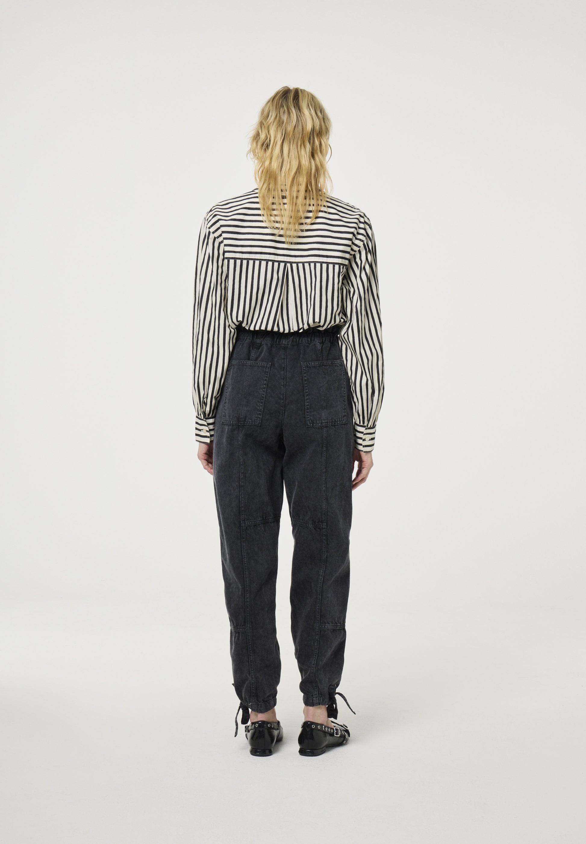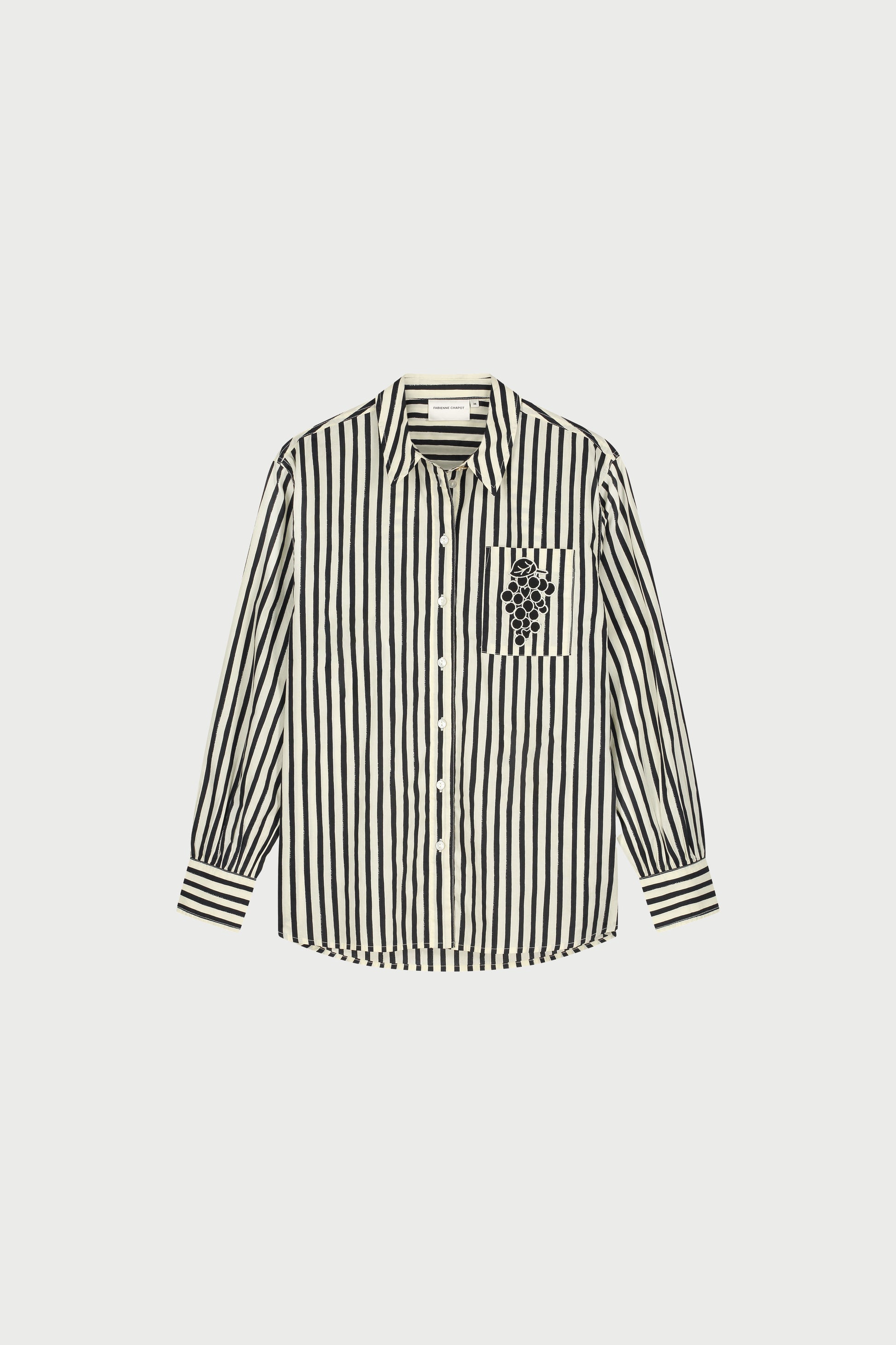 This black and white striped shirt blouse features a small grape appliqué on the chest pocket, the perfect choice for a classic and elegant look. Made from 100% organic cotton, it offers exceptional comfort while being environmentally friendly. Pair it with black tailored trousers for a timeless and refined outfit