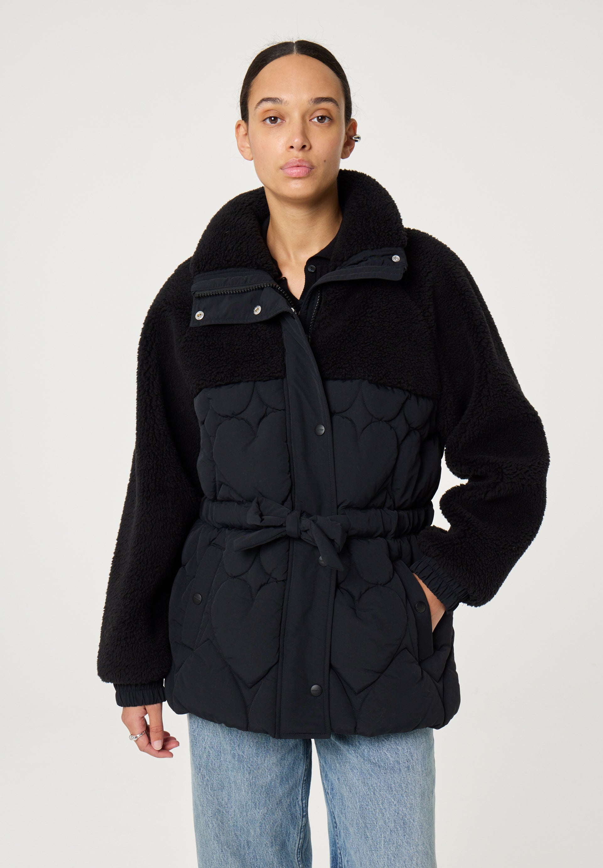 This black padded jacket features a high neck with button closure up to the top and an adjustable drawstring waist for a tailored fit. Soft teddy fabric accents the shoulders, chest, and sleeves, while the front and back panels showcase a quilted heart pattern. A warm and stylish jacket designed for cold weather with unique texture details.