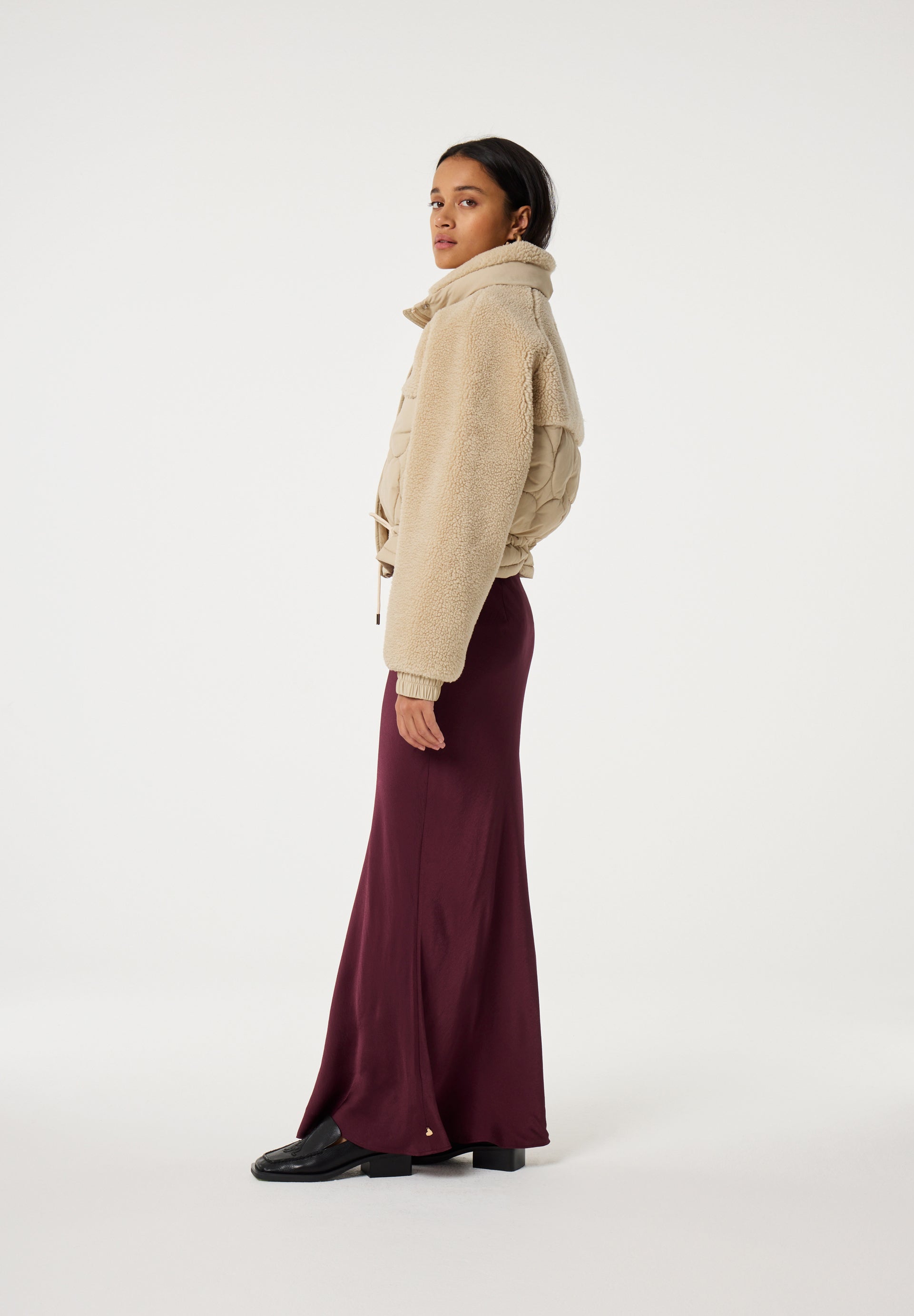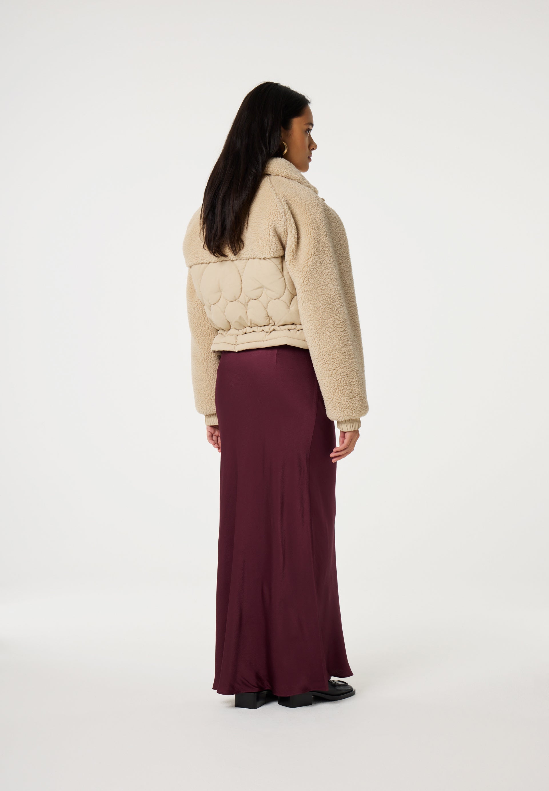 This cream padded jacket features a high neck with button closure up to the top and an adjustable drawstring waist for a tailored fit. Soft teddy fabric accents the shoulders, chest, and sleeves, while the front and back panels showcase a quilted heart pattern. A warm and stylish jacket designed for cold weather with unique texture details.