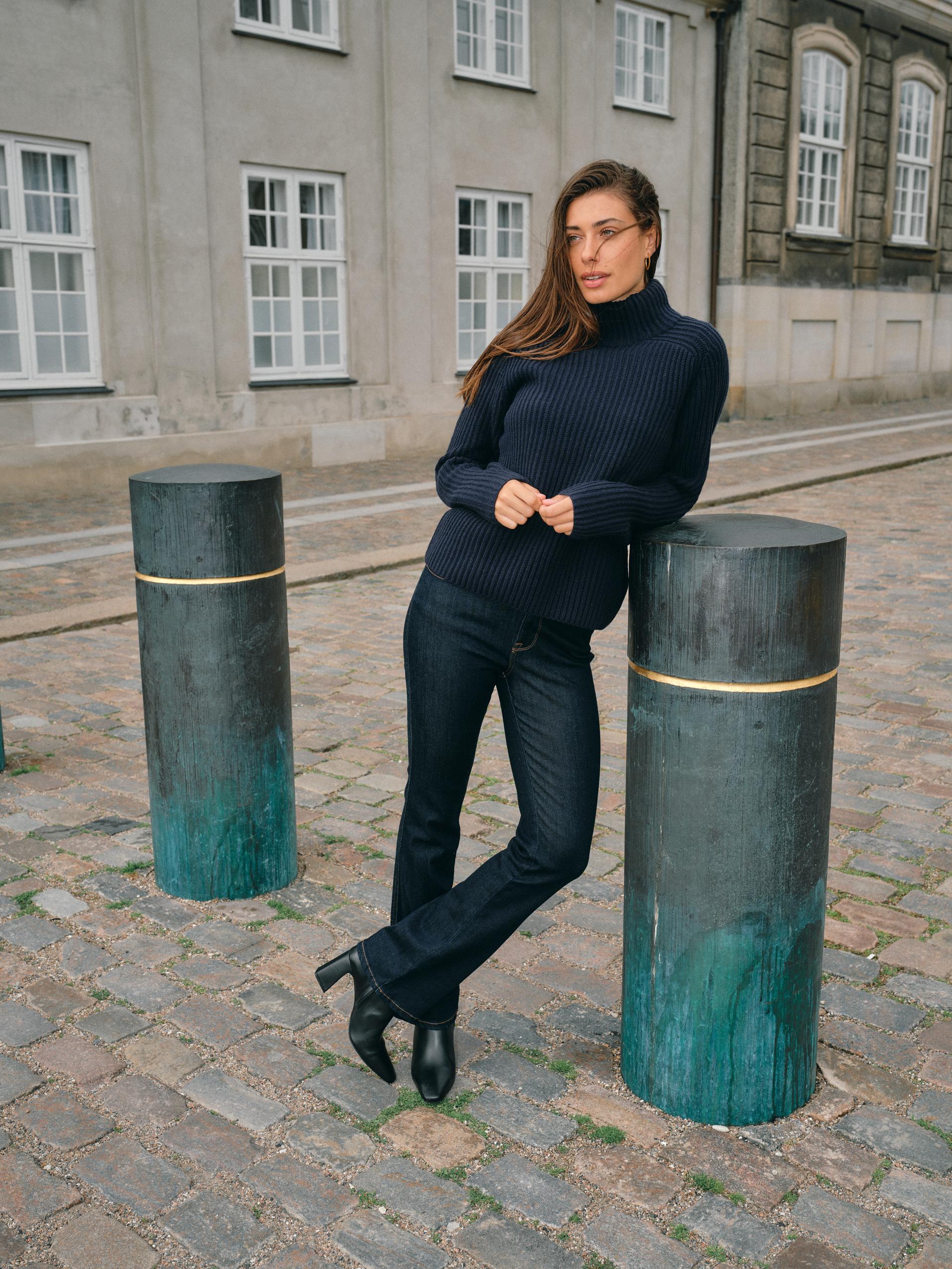 Chic flare-fit jeans, designed with flattering high rise and crafted from a luxurious blend of viscose, cotton, and lyocell for a supremely soft finish. Finished with a timeless five-pocket design and striking contrast stitching against the rich dark denim, they exude effortless sophistication. Pair them with a statement tee and an oversized blazer.