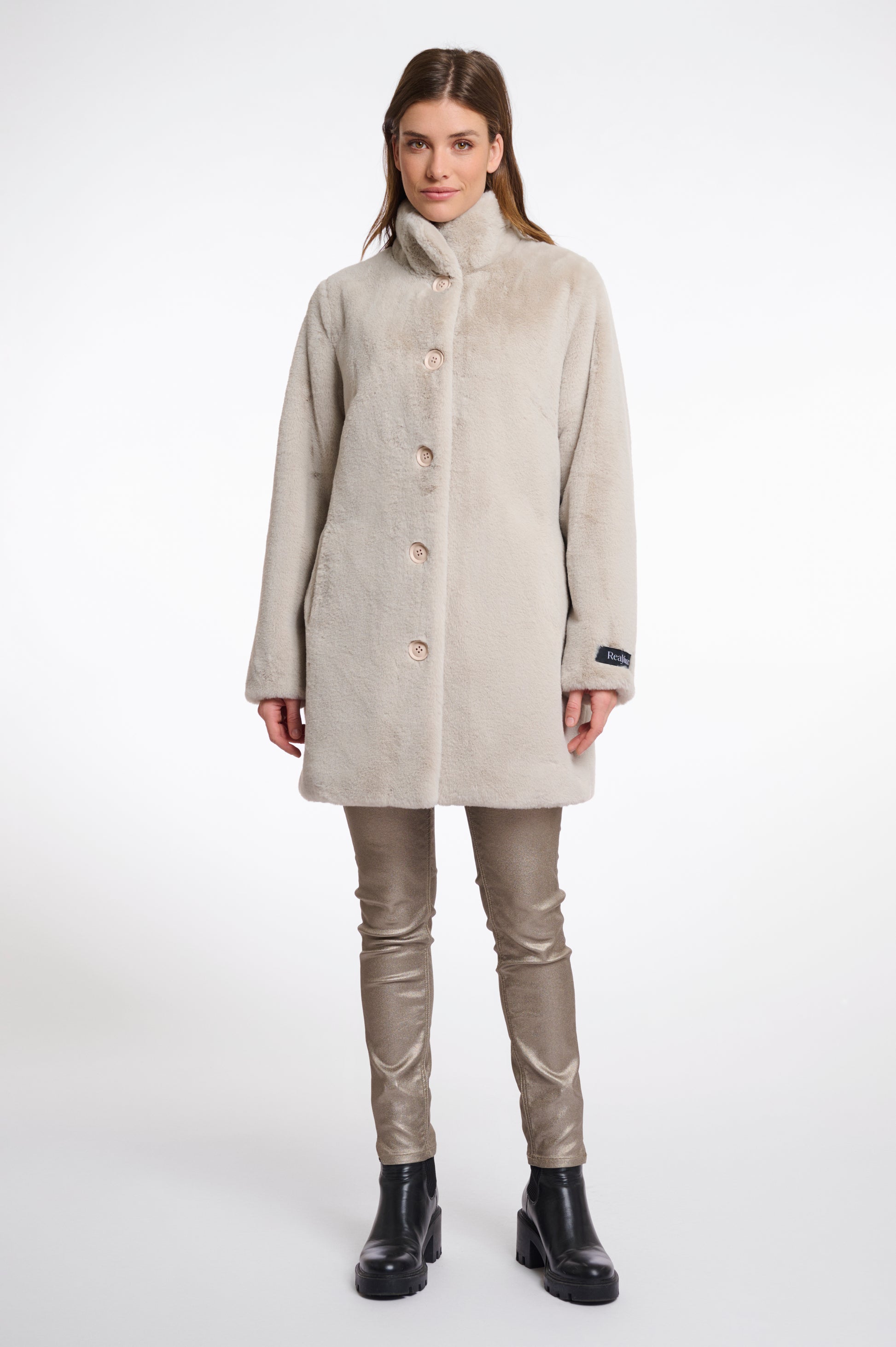 The Nonna coat has a medium-length cut with a high neck collar, button up fastening and two hidden pockets on the sides. It's the perfect piece to snuggle up in and feel warm and stylish. You won't want to take this coat off. The 'Real faux' label on the sleeve can be removed.