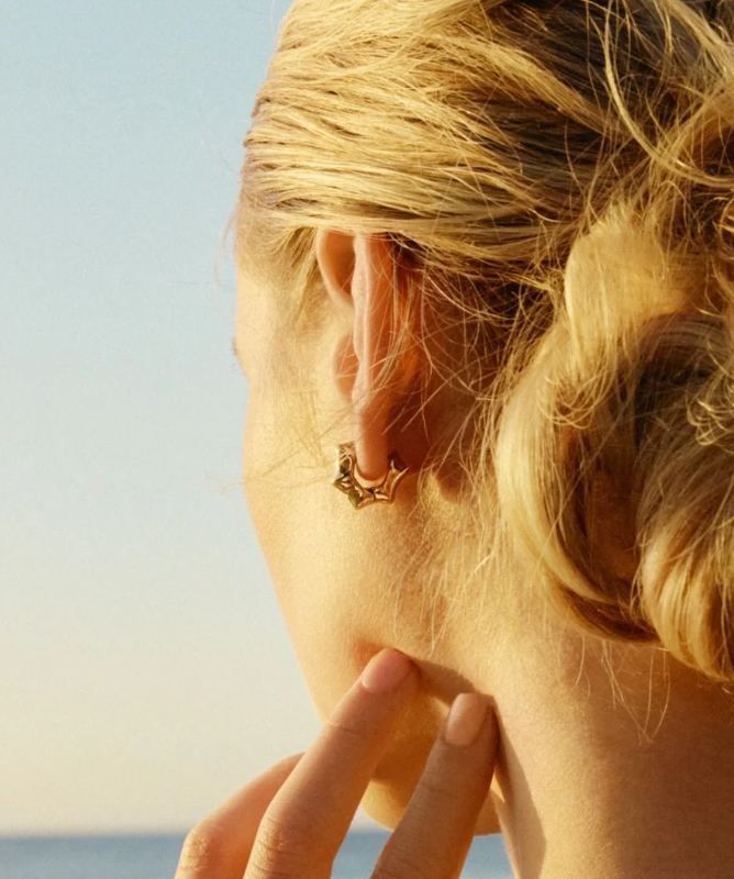 The pattern of peaks and troughs in Bamboo is the inspiration for the evocative Cane line. The pieces are wonderfully light despite their undulating form. The smaller multihoops are the perfect twin with the eye-catching bangle from the same line. Seen here in 14K gold plating.